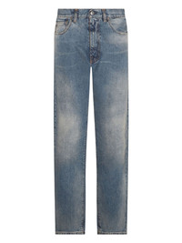 distressed straight-leg jeans Maison Margiela showcases its denim prowess with these straight-leg jeans. Crafted from light-blue cotton denim, they’re finished with distressed detailing and the signature four-stitch logo at the back. Highlights - Light blue - Cotton - Washed denim - Mid-rise - Belt loops - Classic five pockets - Signature four-stitch logo - Logo patch to the rear - Straight leg - Concealed fly and button fastening Made in Italy Composition Outer: Cotton 100% Lining: Polyester 65%, Cotton 35% SIZE & FIT Measurement FRONT RISE 11.02 in(28 cm) INSIDE LEG 32.67 in(83 cm) HIPS 35.43 in(90 cm) LEG OPENING 14.17 in(36 cm) WAIST 26.77 in(68 cm) Washing instructions Machine Wash