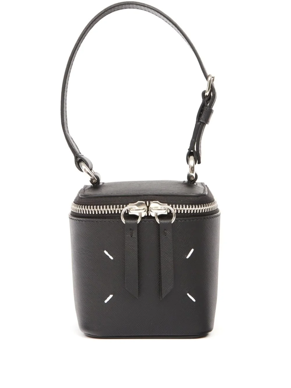 mini Cube tote bag Highlights - Black - Saffiano leather - Signature four-stitch logo - All-around zip fastening - Adjustable top handle - Main compartment - Internal card slot - Internal logo stamp - Full lining - Silver-tone hardware Made in Italy Composition Lining: Polyurethane 50%, Nylon 50% Outer: Calf Leather 100% SIZE & FIT Measurement DEPTH 3.54 in(9 cm) HANDLE 6.29 in(16 cm) HEIGHT 3.93 in(10 cm) WIDTH 3.54 in(9 cm)