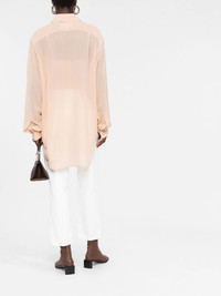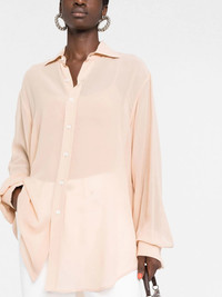 four-stitch silk shirt The semi-sheer silk construction of this Maison Margiela shirt lends its oversized silhouette a delicate touch. The tonal top is simply adorned with the brand's signature four-stitch logo on the back - a subtle take on branding that speaks to the label's minimalism. Highlights - Blush beige - Silk - Signature four-stitch logo - Oversize frame - Semi-sheer construction - Classic collar - Front button placket - Long sleeves - Buttoned cuffs - Asymmetric hem - Curved hem Made in Italy Composition Silk 100% SIZE & FIT Model measurements Height 5 ft 10 in(1.77 m) Bust/Chest 32.28 in(82 cm) Hips 35.03 in(89 cm) Waist 25.19 in(64 cm) Washing instructions Dry Clean Only