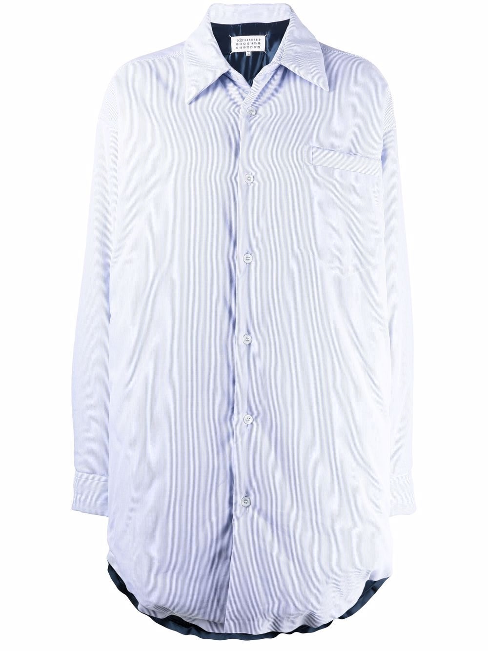 oversized shirt jacket blue cotton padded design front button fastening classic collar long sleeves buttoned cuffs curved hem Made in Italy Composition Outer: Cotton 100%, Polyester 100% Lining: Viscose 100% SIZE & FIT Model measurements Height 5 ft 10 in(1.78 m) Bust/Chest 31.49 in(80 cm) Hips 37 in(94 cm) Waist 23.62 in(60 cm) FittingInformation This piece fits true to size. We recommend you get your regular size Cut for an oversized fit Made with a mid-weight non-stretch fabric Washing instructions Hand Wash