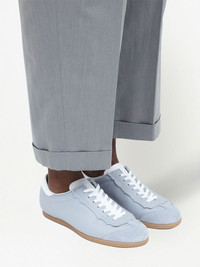 Featherlight low-top sneakers Presented in a light blue colourway, these low-top sneakers from Maison Margiela are crafted from smooth calf leather with suede panelling. Highlights - Panelled low-top sneakers from maison margiela featuring light blue, calf leather, suede panelling, round toe, front lace-up fastening, contrasting heel counter and flat rubber sole. Made in Italy Composition Outer: Calf Leather 100% Sole: Rubber 100% Lining: Polyester 100% SIZE & FIT FittingInformation This piece fits small – take one size up