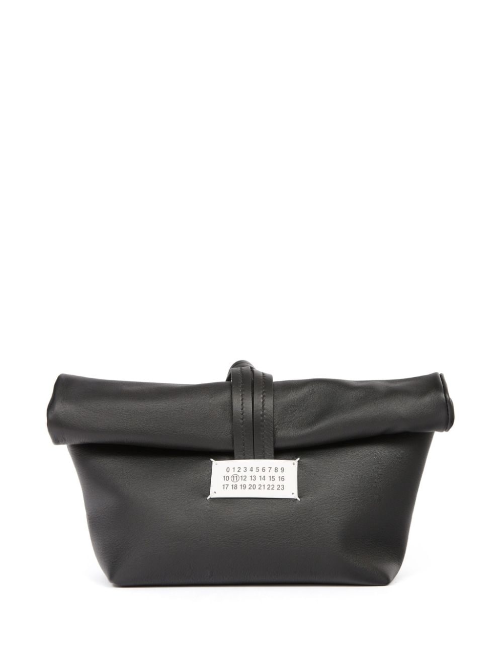 Paper clutch bag Highlights - Black - Calf leather - Signature numbers motif - Wrist strap - Main compartment Made in Italy Composition Lining: Cotton 100% Outer: Calf Leather 100% SIZE & FIT Measurement DEPTH 3.34 in(8.5 cm) HEIGHT 7.08 in(18 cm) WIDTH 11.81 in(30 cm)