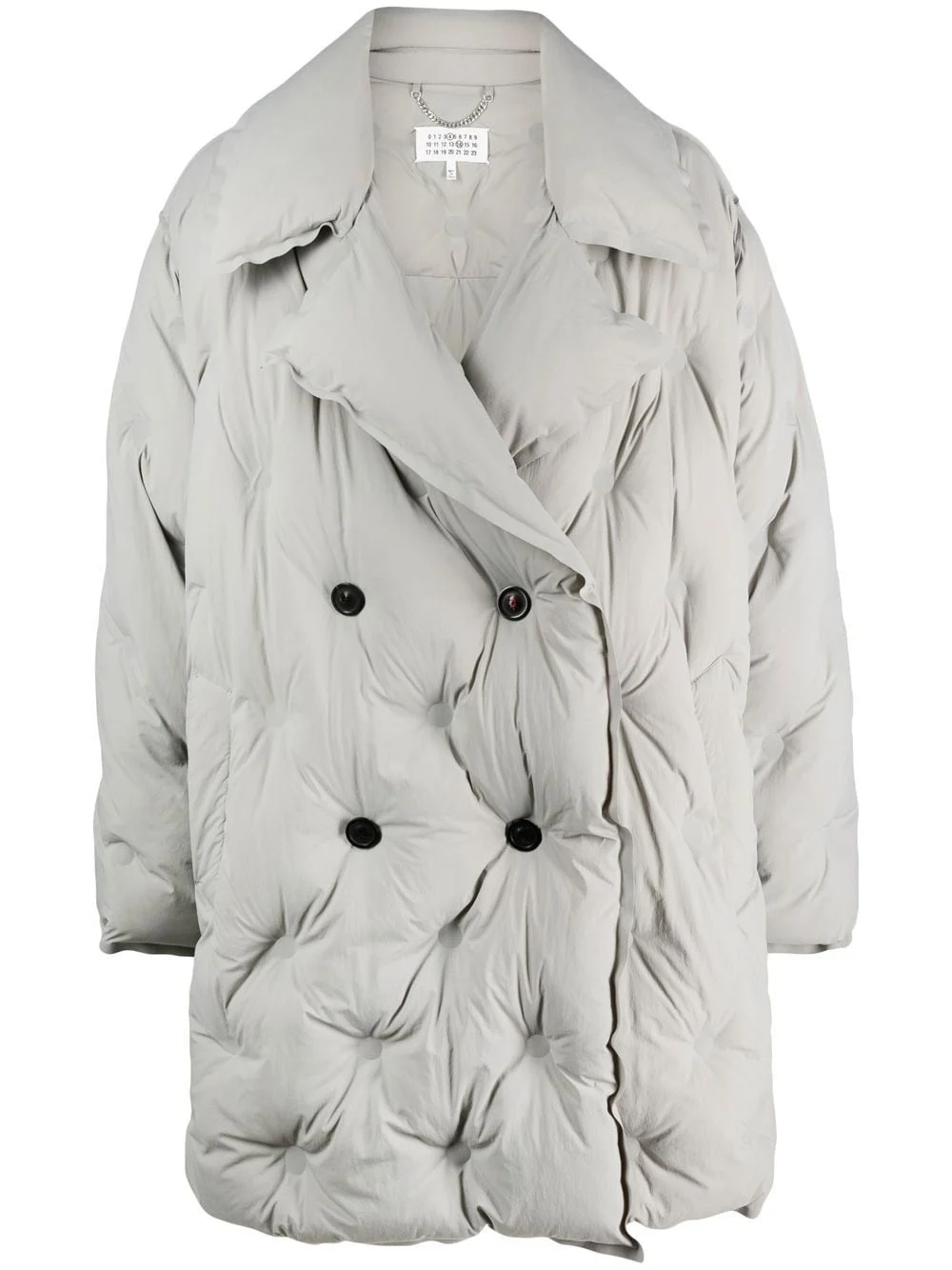 peak lapel padded coat grey padded design quilted finish wide peak lapels single-breasted button front fastening long sleeves slip pockets to the sides straight hem Made in Italy Composition Outer: Polyamide 100% Lining: Polyester 100% SIZE & FIT Model measurements Height 6 ft 1 in(1.85 m) Bust/Chest 35.82 in(91 cm) Hips 37.79 in(96 cm) Waist 29.13 in(74 cm) FittingInformation This piece fits true to size. We recommend you get your regular size Cut for an oversized fit Made with a mid-weight non-stretch fabric Washing instructions Dry Clean Only