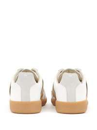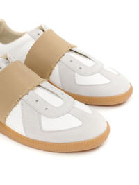 Replica leather sneakers Maison Margiela builds on its iconic Replica line with these white sneakers. Crafted from smooth calf leather to a slip-on silhouette, they're distinguished by the elasticated band that wraps around the midfoot, adding a unique element. They're finished with suede trim and the brand's single-stitch logo at the heel. Highlights - White/light grey/beige - Calf leather - Suede trim - Signature single-stitch logo - Round toe - Elasticated strap - Slip-on style - Branded insole - Rubber outsole Made in Italy Composition Leather 100% SIZE & FIT Measurement HEEL 1.37 in(3.5 cm) Sole height 0.98 in(2.5 cm)