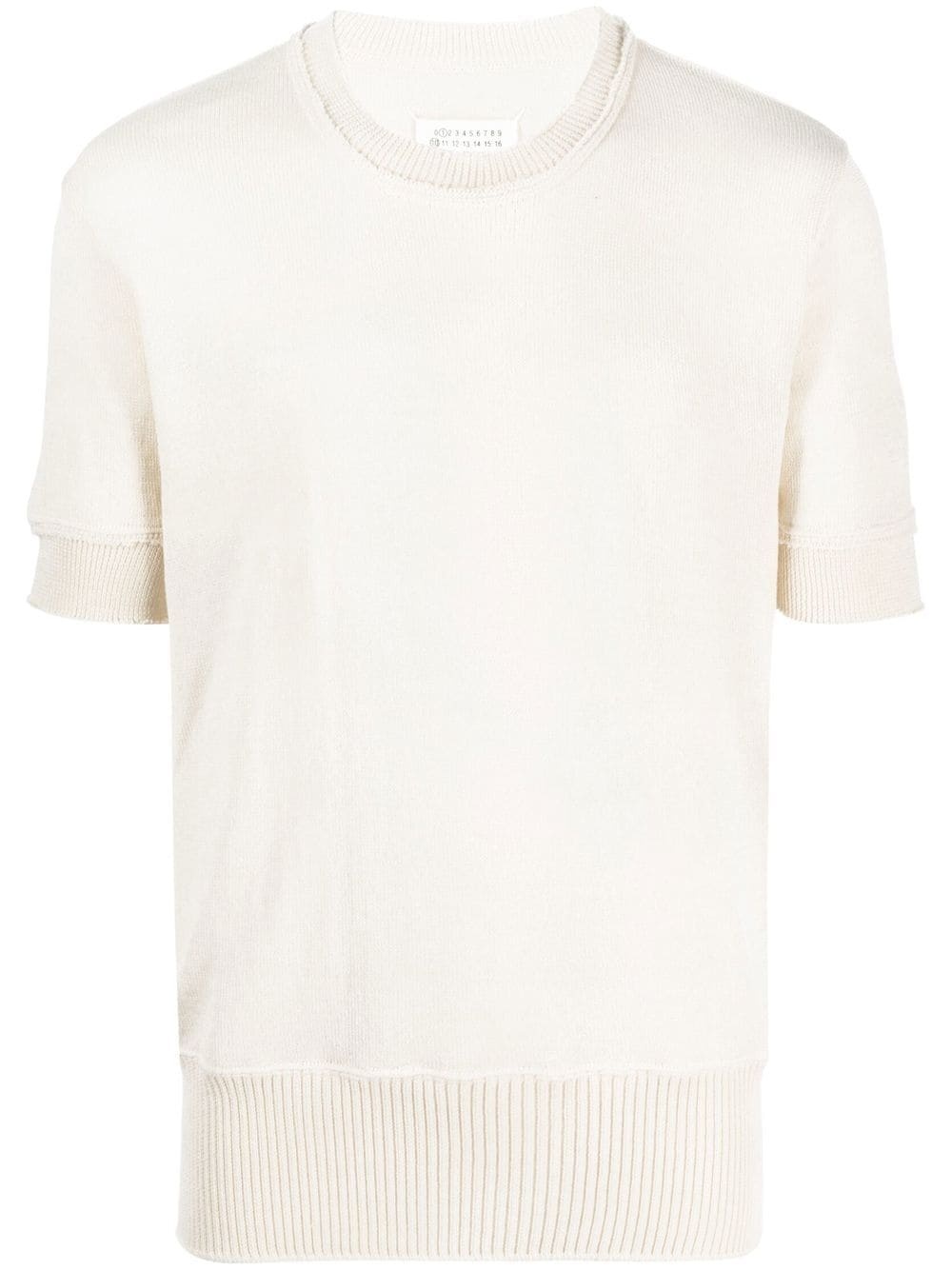 ripped-edge knitted T-shirt cream white wool blend knitted construction round neck ripped detailing short sleeves straight hem Imported Composition Lining: Wool 62% Acrylic 26%, Polyamide 12% SIZE & FIT Model measurements Height 6 ft 3 in(1.91 m) Bust/Chest 37 in(94 cm) Hips 37.79 in(96 cm) Waist 28.34 in(72 cm) FittingInformation This piece fits true to size. We recommend you get your regular size Cut for a slim fit Made with a mid-weight fabric Washing instructions Dry Clean Only