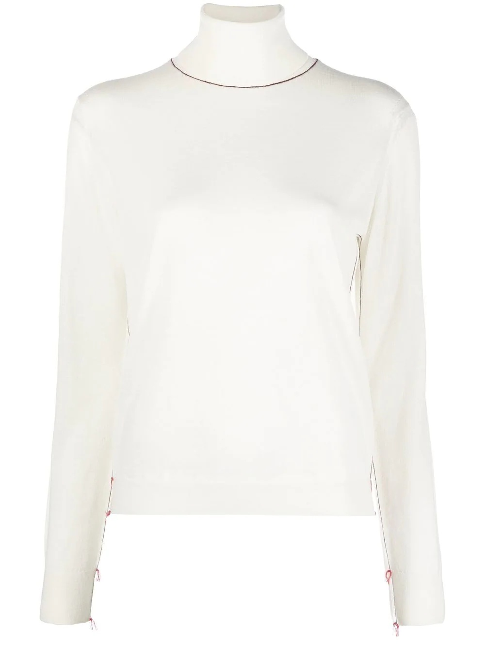 Work-In-Progress high-neck jumper Maison Margiela presents a minimal approach with this wool jumper, simply decorating the roll-neck piece with a contrast stitching detail. Highlights - Cloud white - Wool - Ribbed detailing - Contrast stitching - Roll neck - Long sleeves - Straight hem Made in Italy Composition Wool 100% SIZE & FIT Model measurements Height 5 ft 10 in(1.78 m) Bust/Chest 31.49 in(80 cm) Hips 35.43 in(90 cm) Waist 24.4 in(62 cm) Measurement BUST 35.43 in(90 cm) LENGTH 22.04 in(56 cm) SLEEVE LENGTH 23.62 in(60 cm) Shoulder Width 14.56 in(37 cm) FittingInformation Designed for a slim fit that sits just away from the body offering a close yet comfortable fit Made with a lightweight knit, this piece offers some stretch This piece fits true to size – take your usual size Washing instructions Dry Clean Only