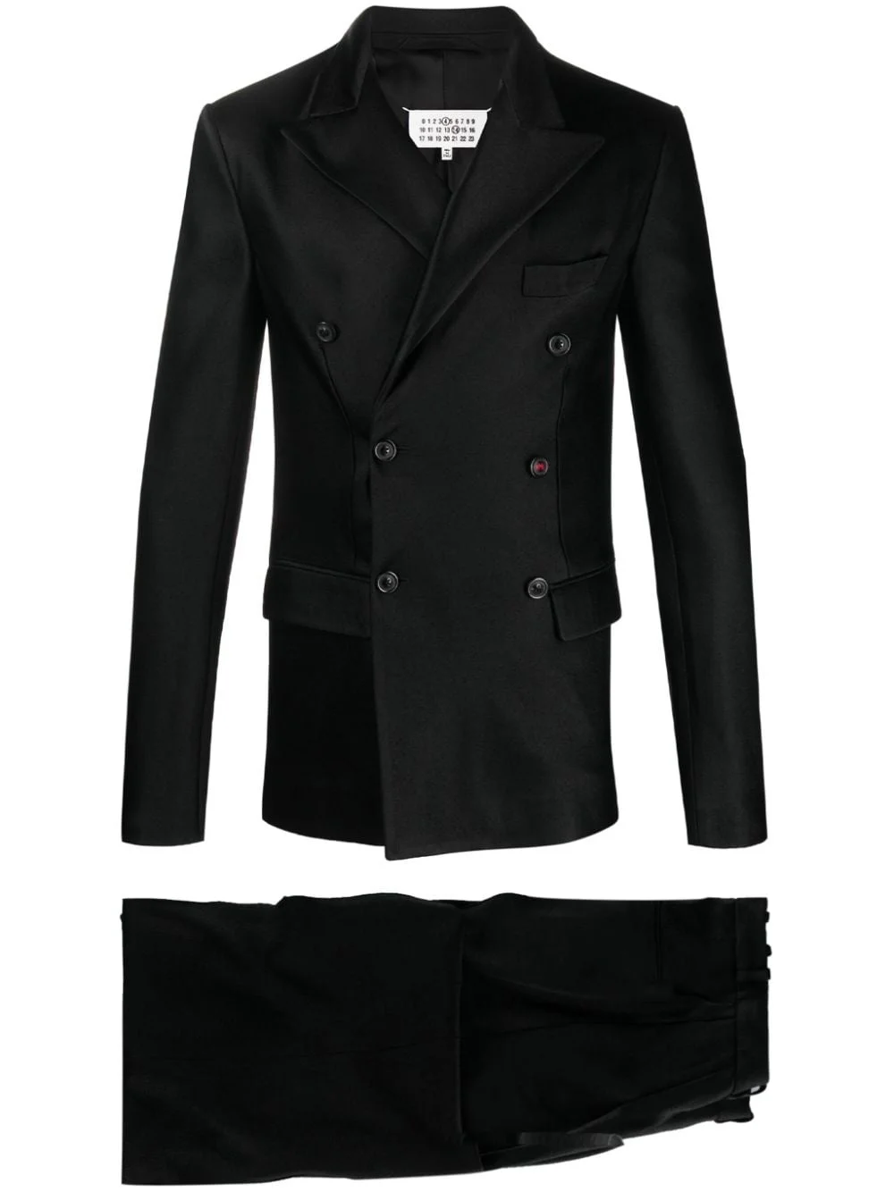 satin-weave double-breasted blazer Maison Margiela delivers a refined yet relaxed aesthetic in the form of this suit. Crafted from a blend of cotton and silk, this set is presented in classic black with a nonchalant, drop-shoulder silhouette. Highlights - Black - Blazer: - Satin weave - Signature four-stitch logo - Logo-embossed buttons - Notched lapels - Double-breasted button fastening - Long sleeves - Split cuffs - Chest welt pocket - Two front flap pockets - Straight hem - Full lining - Trousers: - Pressed crease - Wide leg - Mid-rise - Concealed front fastening - Two side inset pockets - Two rear jetted pockets Made in Italy Composition Lining: Cotton 100%, Viscose 68%, Silk 32% Outer: Viscose 52%, Acetate 48% Washing instructions Dry Clean Only