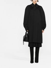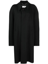 single-breasted coat Boasting a minimal design, but never forgetting the brand's creative side, this single-breasted coat from Maison Margiela's AW22 collection arrives in a black colourway, enhanced with a signature four-stitch logo on the back. This model is crafted from a cotton and virgin wool blend and features a straight, relaxed cut. Highlights - Black - Cotton - Signature four-stitch logo - Classic collar - Concealed front fastening - Two diagonal pockets to the sides - Long sleeves - Straight hem Made in Italy Composition Lining: Cotton 100%, Viscose 100% Outer: Viscose 52%, Virgin Wool 48% SIZE & FIT Model measurements Height 5 ft 10 in(1.77 m) Bust/Chest 31.49 in(80 cm) Hips 35.03 in(89 cm) Waist 23.22 in(59 cm) FittingInformation This piece fits true to size. We recommend you get your regular size Cut for a loose fit Made with a mid-weight non-stretch fabric Washing instructions Dry Clean Only