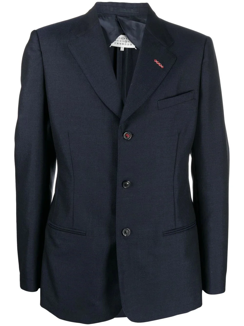 single-breasted tailored blazer single-breasted tailored blazer from Maison Margiela featuring navy blue, wool blend, front button fastening, long sleeves, two side welt pockets and chest welt pocket. Made in Italy Composition Lining: Cotton 100%, Viscose 100% Outer: Wool 70%, Mohair 30% SIZE & FIT Model measurements Height 5 ft 10 in(1.77 m) Bust/Chest 35.03 in(89 cm) Hips 35.03 in(89 cm) Waist 23.62 in(60 cm) FittingInformation This piece fits true to size. We recommend you get your regular size Cut for a slim fit Made with a mid-weight non-stretch fabric Washing instructions Dry Clean Only