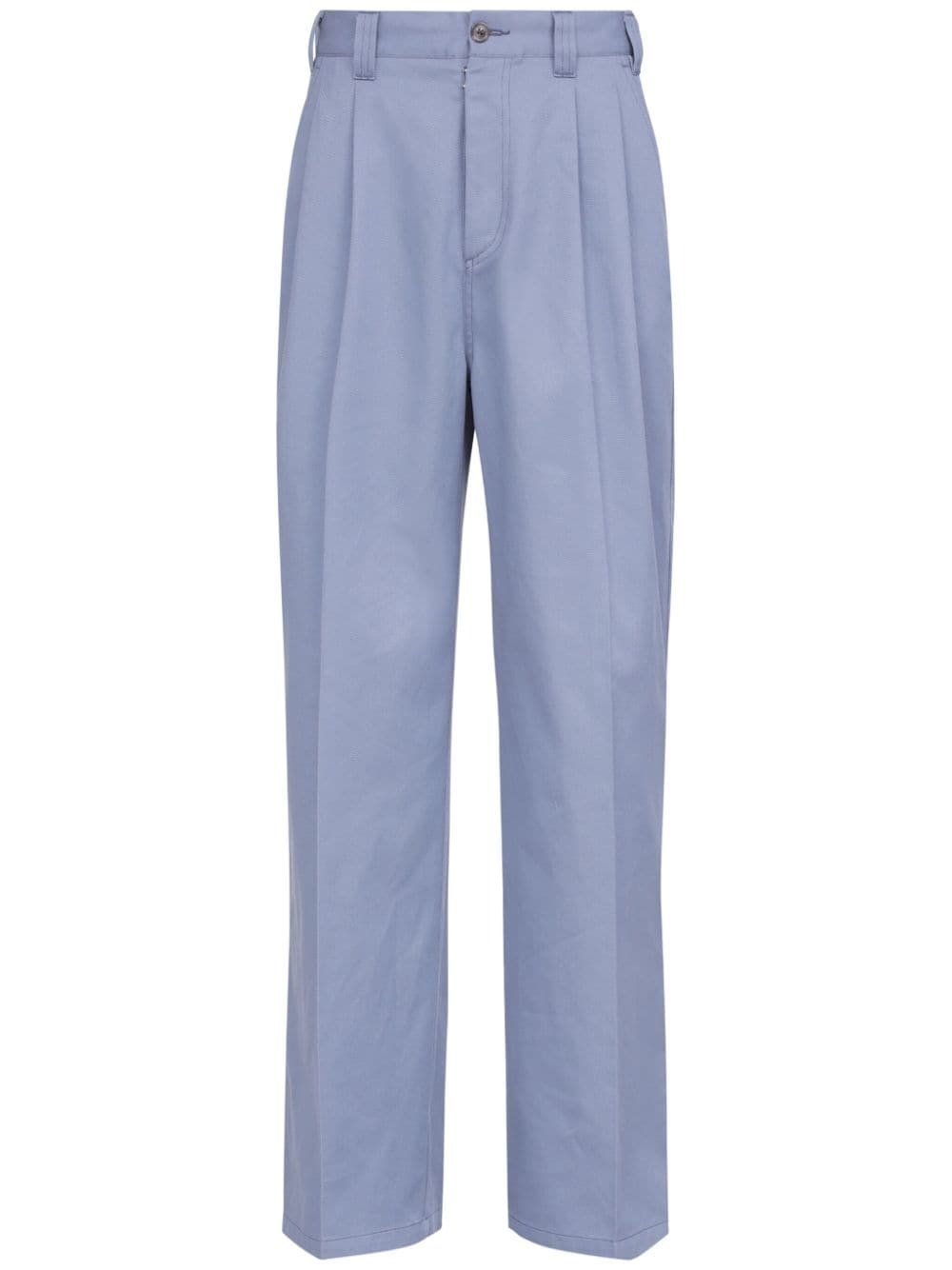 Skater chino trousers Highlights - Blue - Cotton blend - Belt loops - Pleat detailing - Front button and zip fastening - Signature four-stitch logo - Rear elasticated waistband - Wide leg - Two side slit pockets - Two rear welt pockets - Long length Made in Italy Composition Polyester 60%, Cotton 40% SIZE & FIT Measurement INSIDE LEG 32.51 in(82.6 cm) Hem Width 25 in(63.5 cm) FRONT RISE 14.01 in(35.6 cm) WAIST 30.98 in(78.7 cm) HIPS 42 in(106.7 cm)