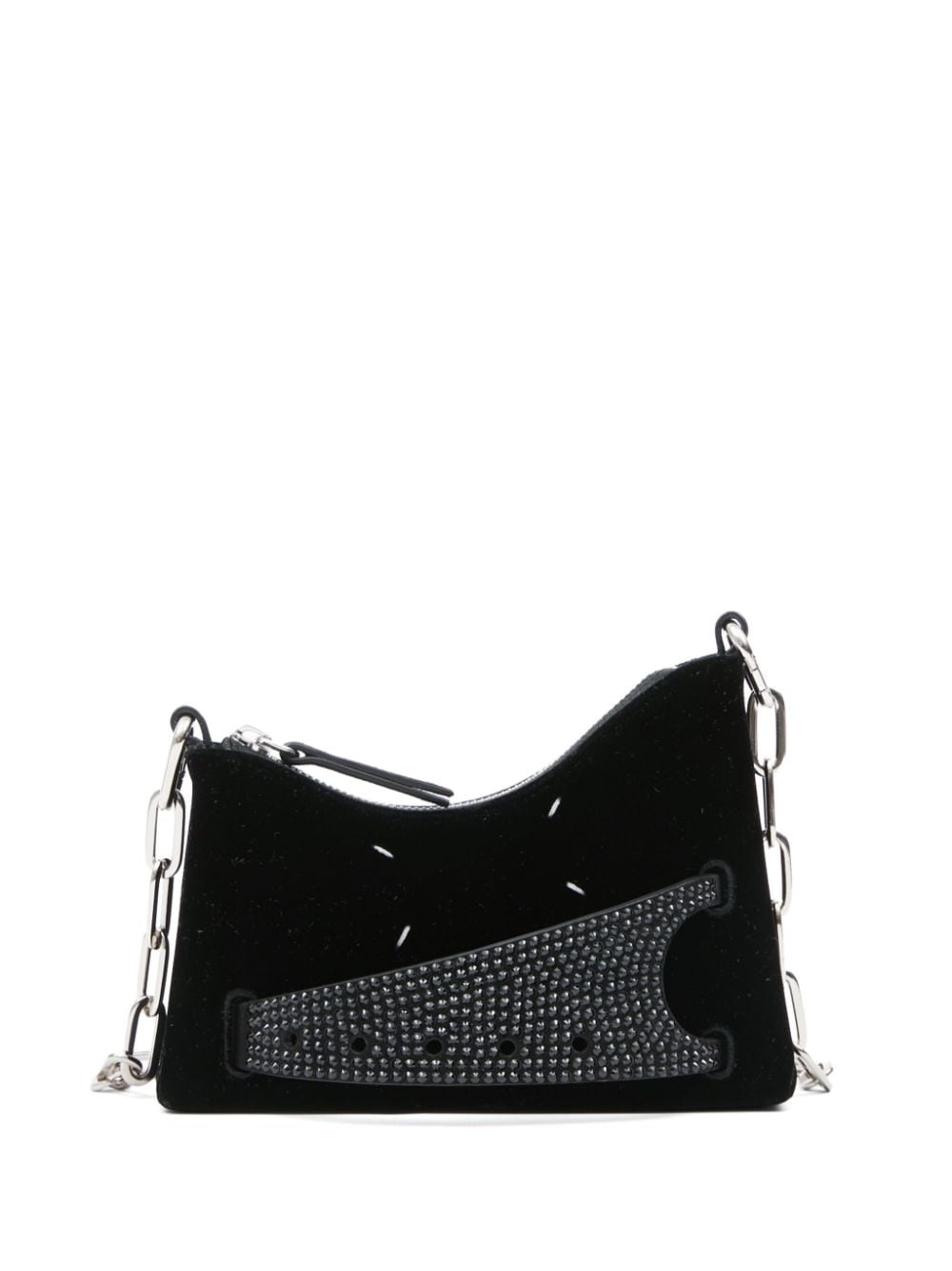 small Snatched leather shoulder bag Maison Margiela's Snatched shoulder bag captures the label's avant-garde style through its arched, asymmetric shape. This iteration is crafted in Italy from black velvet, featuring a crystal-embellished front handle that gives a name to the design. The iconic four-stitch logo appears on the front, providing the finishing touch. Highlights - Black - Goatskin - Velvet - Crystal embellishment - Signature four-stitch logo - Perforated detailing - Front handle - Adjustable detachable shoulder strap - Top zip fastening - Main compartment - Full lining Made in Italy Composition Lining: Goat Skin 100% Outer: Crystal 100%, Viscose 65%, Cupro 35% SIZE & FIT Measurement DEPTH 1.96 in(5 cm) HEIGHT 5.31 in(13.5 cm) STRAP 22.44 in(57 cm) WIDTH 7.28 in(18.5 cm)