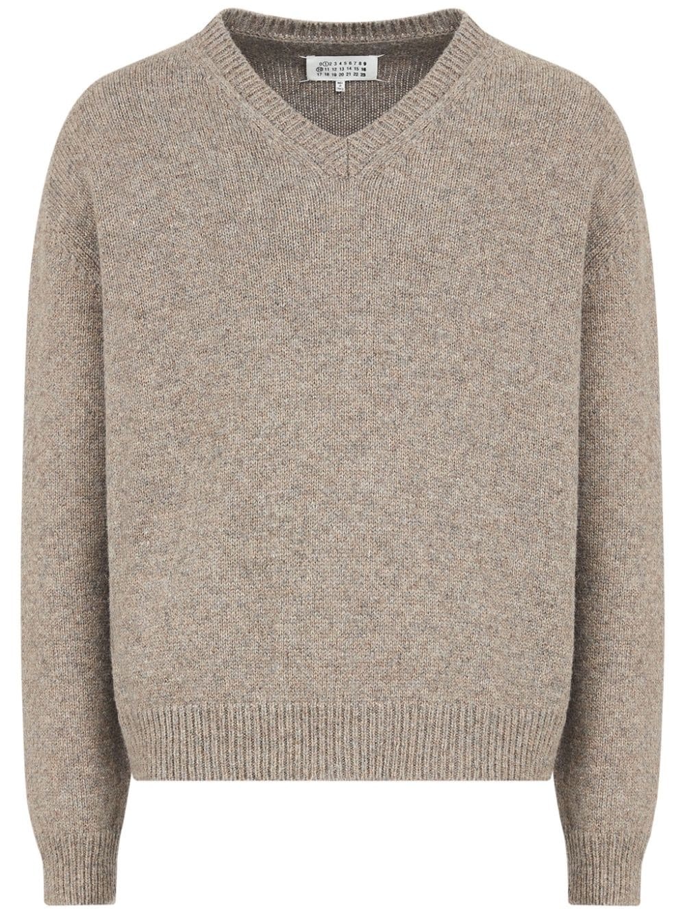 speckle-knit wool jumper Highlights - Light beige - Wool - Speckle knit - Signature four-stitch logo - V-neck - Drop shoulder - Long sleeves - Ribbed cuffs and hem Made in Italy Composition Wool 100% Washing instructions Do Not Wash/Do Not Dry Clean