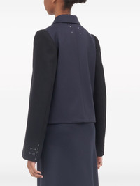 Spliced double-breasted wool blazer Maison Margiela's uncoventional design aesthetic is presented with this jacket. Crafted from a navy blue wool, it features a front button fastening, two side flap pockets and long sleeves. It is finished with the houses signature four-stitch logo to the rear. Highlights - Navy blue - Wool - Signature four-stitch logo - Two side flap pockets - Front button fastening - Classic collar - Long sleeves - Straight hem Made in Italy Composition Lining: Cotton 100%, Viscose 100% Outer: Wool 100% SIZE & FIT Model measurements Height 5 ft 10 in(1.79 m) Bust/Chest 31.49 in(80 cm) Hips 35.03 in(89 cm) Waist 23.62 in(60 cm) FittingInformation This piece fits true to size. We recommend you get your regular size Cut for a loose fit Made with a mid-weight non-stretch fabric Washing instructions Dry Clean Only