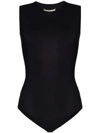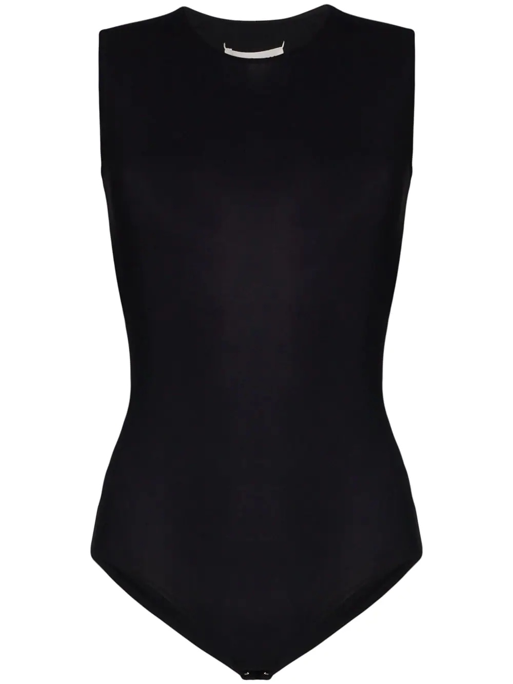 sleeveless jersey bodysuit When it comes to layering, a bodysuit is a staple solution. With a stretch fit, this black style from Maison Margiela will ensure no bunching takes place. Lay the foundation for smooth ensembles. Highlights - Black - Signature four-stitch logo - Stretch design - Round neck - Sleeveless - Snap fastening Made in Italy Composition Polyamide 73%, Elastane 27% SIZE & FIT Model measurements Height 5 ft 11 in(1.8 m) Bust/Chest 31.49 in(80 cm) Hips 37 in(94 cm) Waist 25.98 in(66 cm) FittingInformation Designed for a close fit throughout Made from a lightweight stretch fabric, this piece offers elasticity and flexibility when worn This piece fits true to size – take your usual size Washing instructions Hand Wash