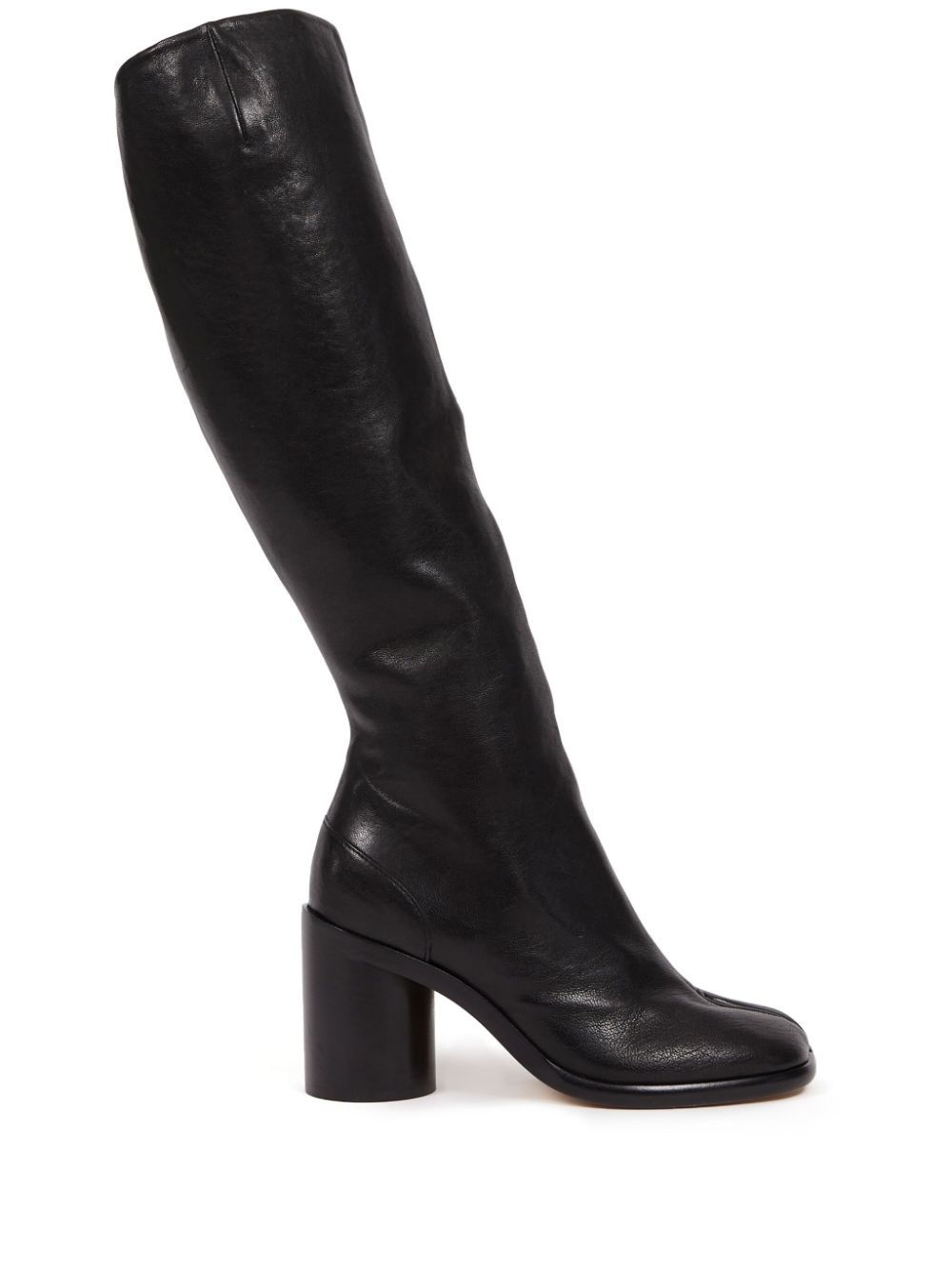 Tabi 80mm knee-high boots Inspired by traditional Japanese split-toe socks and first introduced in Maison Margiela's debut in 1989, the Tabi toe quickly became the brand's main distinguishing signature. Crafted from black lambskin and displaying the iconic motif, these knee-high boots are a bold choice. Made in Italy Composition Lining: Calf Leather 100% Sole: Calf Leather 100% Outer: Lambskin 100% SIZE & FIT Measurement CIRCUMFERENCE 12.59 in(32 cm) HEEL 3.14 in(8 cm) HEIGHT 14.56 in(37 cm) Sole height 0.39 in(1 cm)