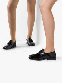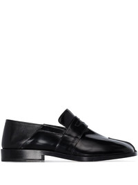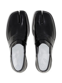 Tabi leather loafers These calf leather loafers from Maison Margiela exhibit the brand's contemporary style. With their signature split-toe silhouette and a slip-on style, this pair reflects the brand's modern take on a classic construction. Highlights - Black - Calf leather - High-shine finish - Signature tabi toe - Penny slot - Folding heel - Square toe - Branded goatskin insole - Flat calf leather sole Made in Italy Composition Outer: Calf Leather 100% Sole: Calf Leather 100% Lining: Lambskin 100% SIZE & FIT FittingInformation This piece fits true to size. We recommend you get your regular size Measurement HEEL 0.9 in(2.3 cm) Sole height 0.39 in(1 cm) HEIGHT 2.16 in(5.5 cm)
