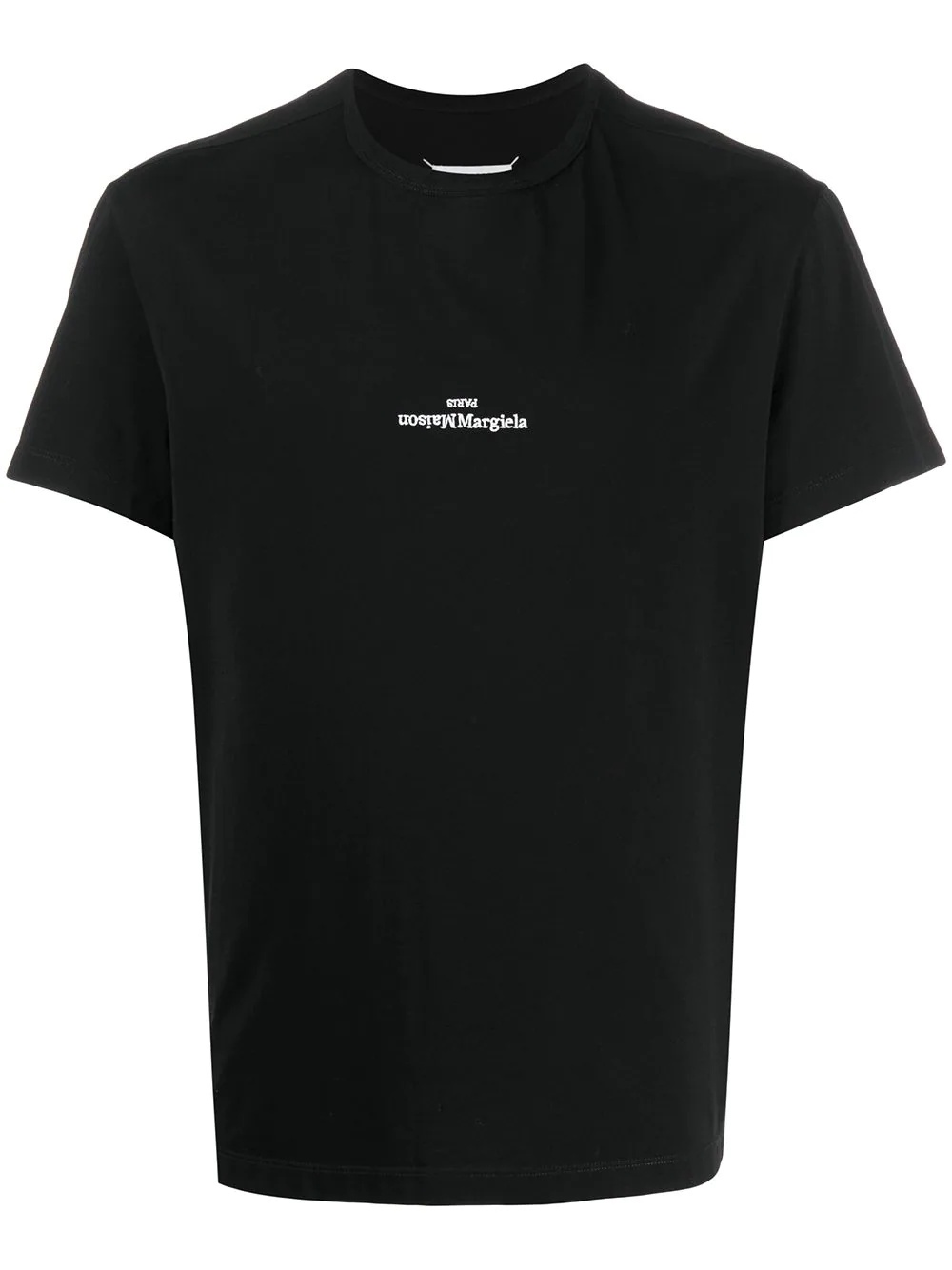 distorted-logo cotton T-shirt Your life may be upside-down and this T-shirt will just follow that assuring that. Constructed from pure cotton, this embroidered upside-down logo T-shirt from Maison Margiela is adorned with a twisted logo. At least, you will be the coolest guy around the block anyway. Highlights - Black - Cotton - Embroidered logo to the front - Crew neck - Short sleeves - Straight hem Imported Composition Cotton 100% SIZE & FIT Model measurements Height 6 ft 2 in(1.87 m) Bust/Chest 38.18 in(97 cm) Hips 36.61 in(93 cm) Waist 29.13 in(74 cm) FittingInformation Designed to be unstructured, offering a loose fit throughout Made from a midweight non-stretch fabric, this piece offers minimal elasticity when worn This piece fits true to size – take your usual size Measurement CHEST 42.12 in(107 cm) Shoulder Width 19.29 in(49 cm) Washing instructions Hand Wash