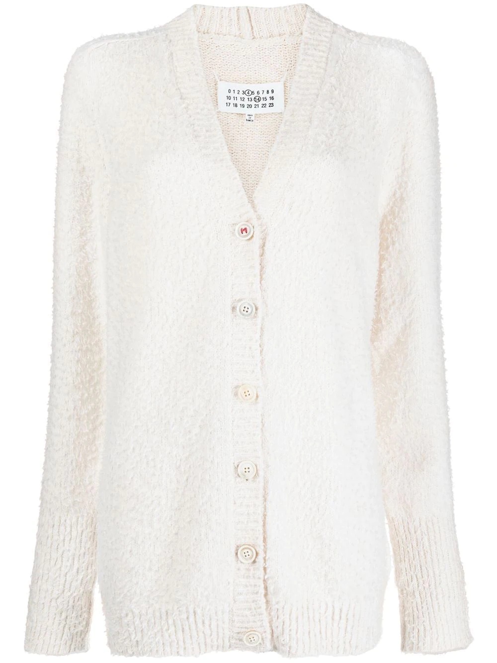 V-neck knitted cardigan Minimal in design, this white-hued cardigan from Maison Margiela boasts a classic knitted appeal. In line with this aesthetic, the French brand subtly adds a printed 'M' over the front button and the signature numbers patch on the inside. Highlights - Ivory white - Cotton blend - Logo print embellishment - Signature numbers motif - Knitted construction - V-neck - Front button fastening - Long sleeves - Ribbed-knit edge Imported Composition Cotton 86%, Polyamide 14% SIZE & FIT Model measurements Height 5 ft 10 in(1.77 m) Bust/Chest 31.49 in(80 cm) Hips 33.85 in(86 cm) Waist 22.44 in(57 cm) Measurement LENGTH 28.34 in(72 cm) WAIST 41.73 in(106 cm) SLEEVE LENGTH 29.13 in(74 cm) HIPS 40.94 in(104 cm) FittingInformation This piece fits true to size. We recommend you get your regular size Cut for a loose fit Made with a mid-weight fabric Washing instructions Dry Clean Only