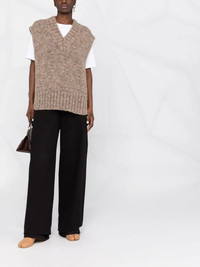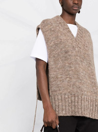 Botanical Dye knitted vest A master of redefining silhouettes, Maison Margiela presents this knitted top. This piece is crafted from a blend of wool and cotton and features heavy ribbing and high side slits, creating a quirky spin on knitwear. Made in Italy Composition Alpaca Wool 42%, Cotton 30%, Wool 28% SIZE & FIT Model measurements Height 5 ft 10 in(1.77 m) Bust/Chest 32.28 in(82 cm) Hips 35.03 in(89 cm) Waist 25.19 in(64 cm) FittingInformation This piece fits true to size. We recommend you get your regular size Cut for a loose fit Made with a mid-weight fabric Washing instructions Dry Clean Only