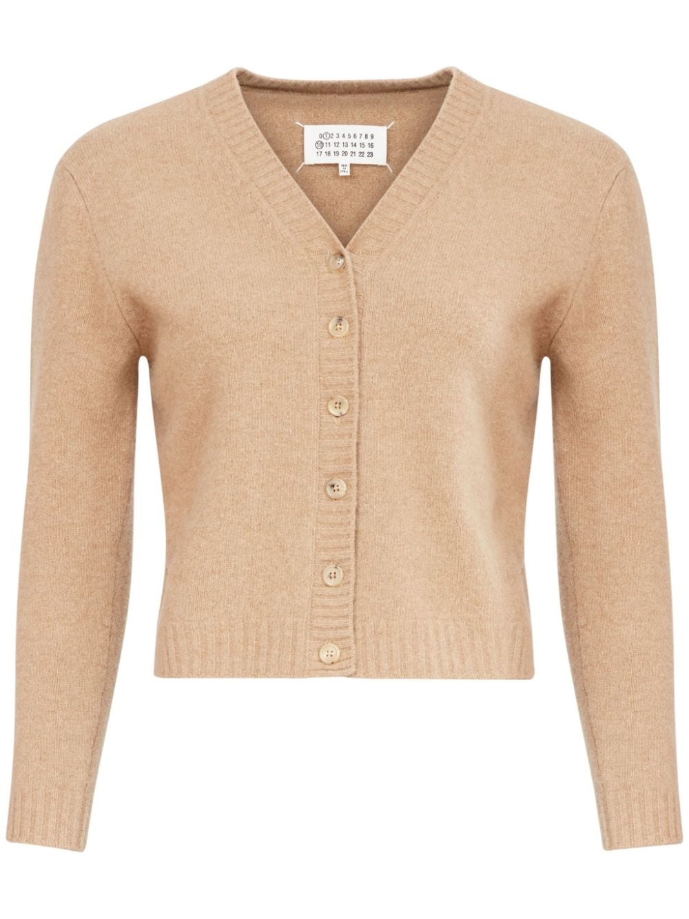 V-neck wool cardigan Highlights - Beige - Wool - Signature four-stitch logo - V-neck - Long sleeves - Front button fastening - Ribbed cuffs and hem - Straight hem Made in Italy Composition Wool 100% SIZE & FIT Measurement SLEEVE LENGTH 20.47 in(52 cm) HIPS 34.64 in(88 cm) LENGTH 21.65 in(55 cm) WAIST 37 in(94 cm) FittingInformation Designed for a relaxed fit, this piece allows for comfort and movement when worn Made with a midweight knit, this piece offers some stretch This piece fits true to size – take your usual size