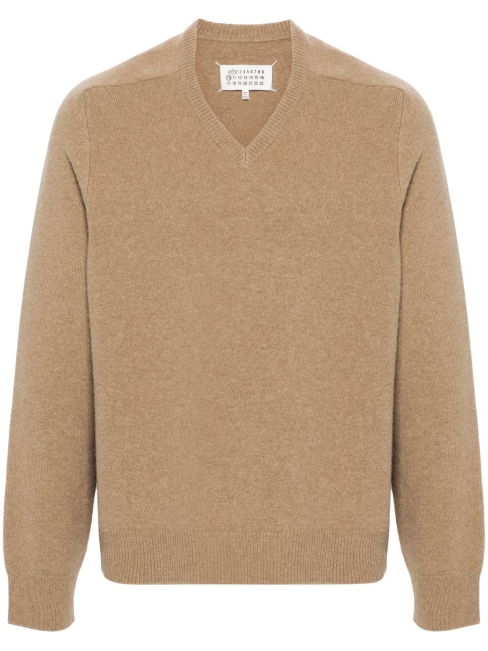 V-neck wool jumper Highlights - Beige - Wool - Knitted construction - Ribbed v-neck - Long sleeves - Ribbed cuffs and hem - Straight hem Made in Italy Composition Wool 100% SIZE & FIT Model measurements Height 6 ft 1 in(1.85 m) Bust/Chest 35.43 in(90 cm) Hips 37.79 in(96 cm) Waist 29.92 in(76 cm) Measurement CHEST 47.24 in(120 cm) SLEEVE LENGTH 36.22 in(92 cm) LENGTH 26.77 in(68 cm) FittingInformation Designed for a relaxed fit, this piece allows for comfort and movement when worn Made with a midweight knit, this piece offers some stretch This piece fits true to size – take your usual size