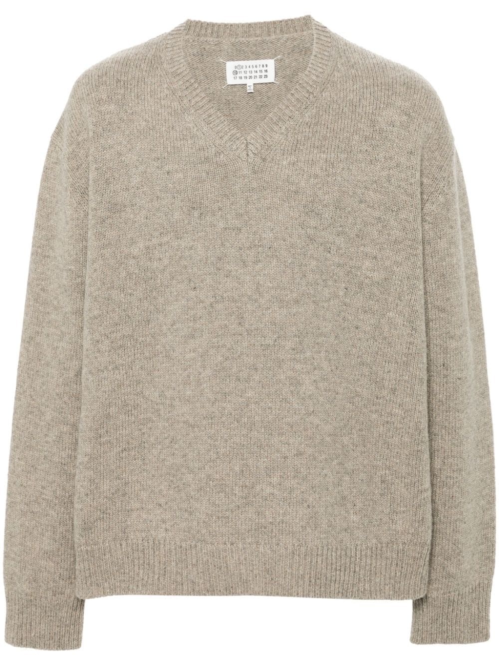 wool sweater Highlights - Taupe grey - Wool - Knitted construction - Melange effect - Ribbed v-neck - Long sleeves - Ribbed cuffs and hem - Straight hem Made in Italy Composition Wool 100% SIZE & FIT Model measurements Height 6 ft 2 in(1.88 m) Bust/Chest 36.61 in(93 cm) Hips 35.82 in(91 cm) Waist 27.95 in(71 cm) FittingInformation Designed to be unstructured, offering a loose fit throughout The ribbed hem offers a close, comfortable fit Made from a midweight non-stretch fabric, this piece offers minimal elasticity when worn This piece fits true to size – take your usual size Washing instructions Dry Clean Only