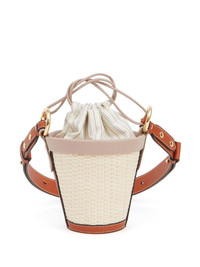 Fire woven bucket bag Highlights - Cream white/brown - Calf leather/raffia - Woven raffia design - Adjustable shoulder strap - Drawstring fastening - Main compartment - Full lining Made in Italy Composition Outer: Raffia 100% Lining: Cotton 80%, Polyester 20% Inner: Calf Leather 100% SIZE & FIT Measurement DEPTH 3.5 in(8.8 cm) HEIGHT 9.1 in(23.1 cm) WIDTH 7.1 in(18 cm)