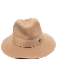 Henrietta felt Fedora hat logo fedora hat from MAISON MICHEL featuring camel brown, wool felt, cotton blend, gold-tone logo plaque, ribbon band and slip-on style. Imported Composition Wool Felt 100%, Cotton 56%, Viscose 44%