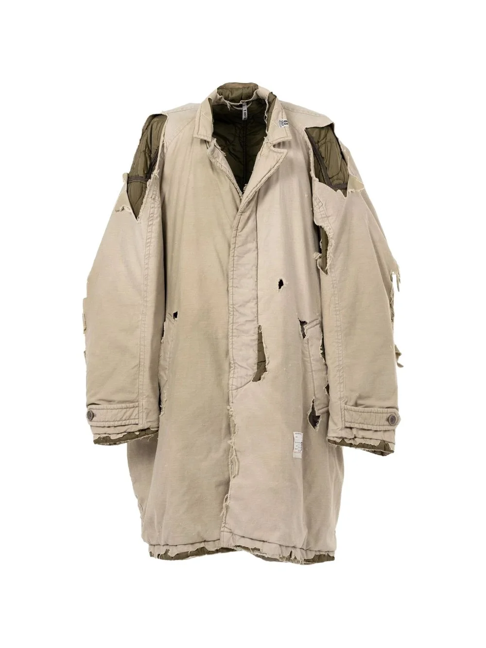 Distressed Balmacaan coat Highlights - Beige - Distressed effect - Raw hem - Button fastening - Applique detail - Dropped shoulders Imported Composition Cotton 100% Washing instructions Read Manufacturer Guidelines