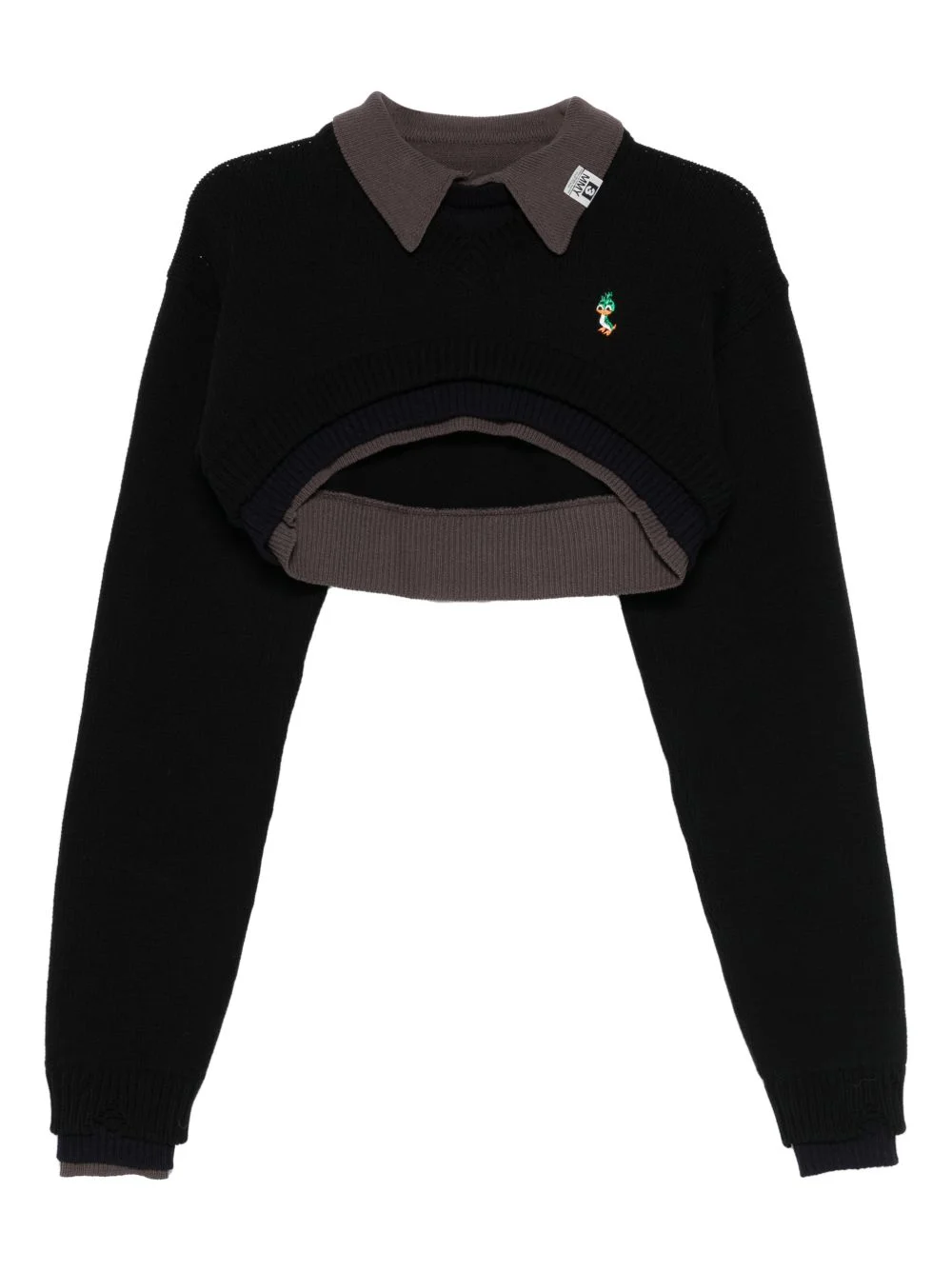 layered cropped sweater Highlights - Black/grey/blue - Layered design - Embroidered motif - Long sleeves - Ribbed cuffs Imported Composition Cotton 50%, Acrylic 50% SIZE & FIT Model measurements Height 5 ft 10 in(1.78 m) Bust/Chest 33.46 in(85 cm) Hips 36.22 in(92 cm) Waist 23.22 in(59 cm) Washing instructions Dry Clean Only