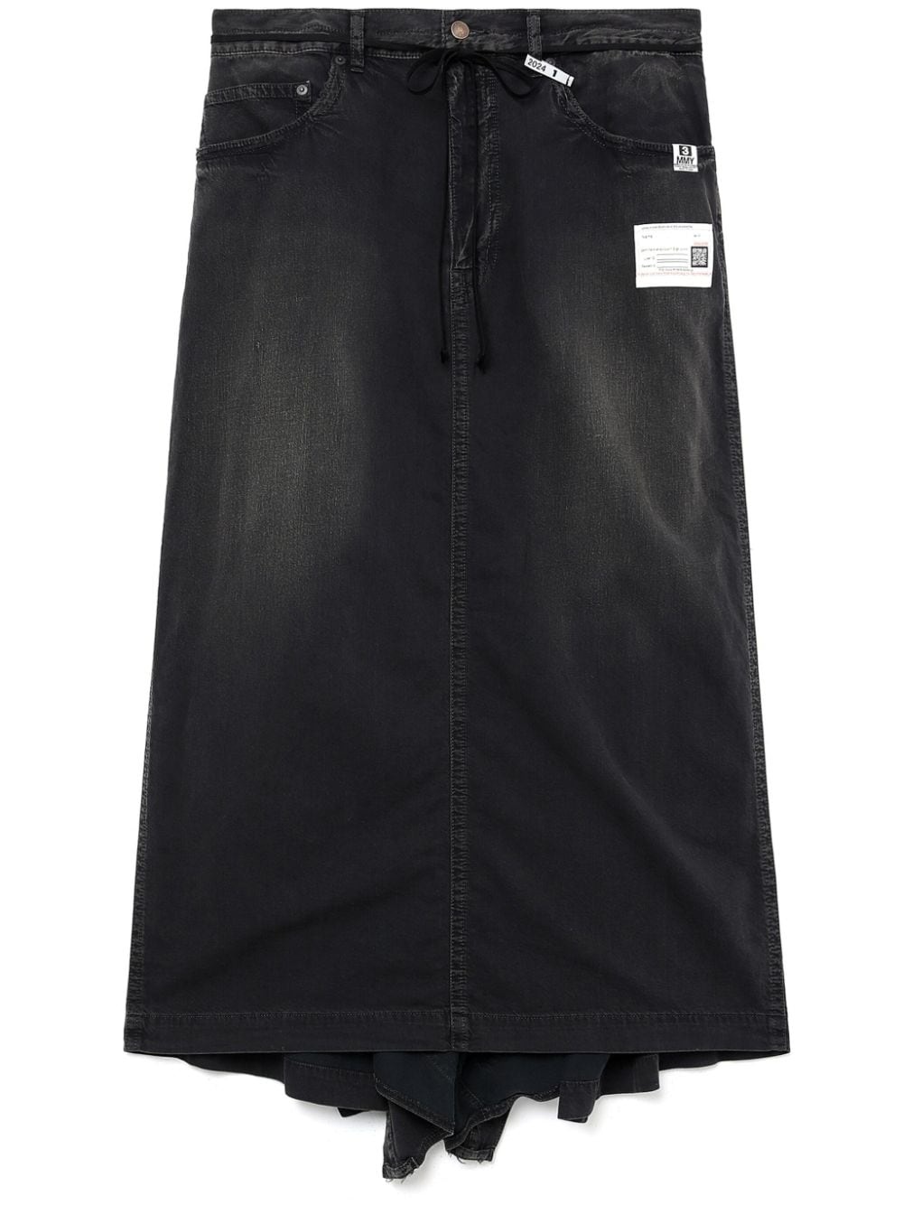 draped denim skirt Highlights - Black - Cotton - Washed denim - Applique logo - Draped detailing - High-waisted - Drawstring waist - Concealed fly and button fastening - Belt loops - Classic five pockets - Long length - High-low hem Imported Composition Cotton 100%