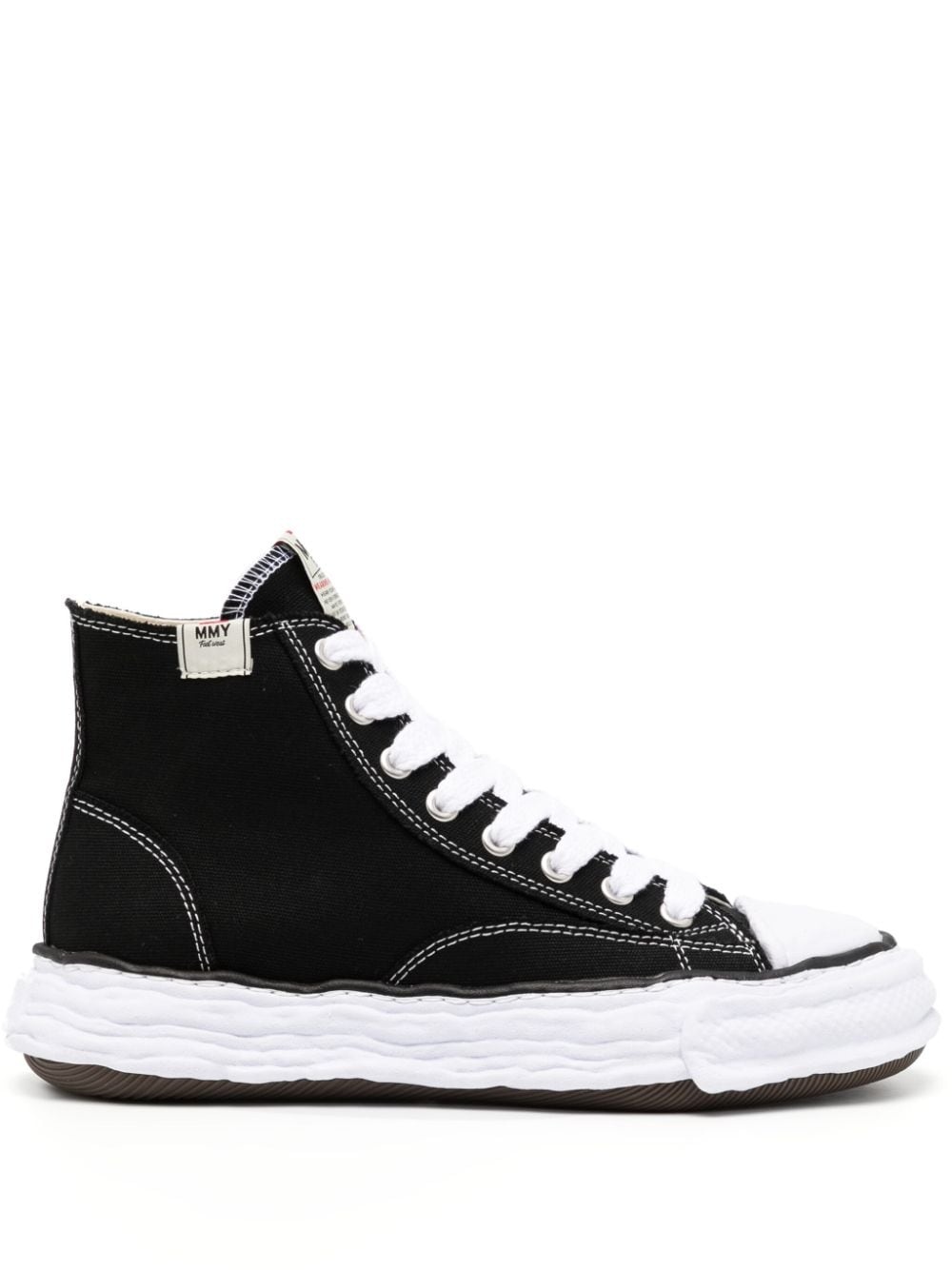 Peterson23 Original Sole sneakers Far-removed from typical clean-cut models, Maison Mihara Yasuhiro's Peterson23 sneakers are infused with the brand's avant-garde aesthetic. Crafted from cotton canvas to a high-top silhouette, they are grounded on the brand's Original Sole, a rubber outsole hand-modelled by namesake designer Mihara Yasuhiro, hence its irregular appearance. Highlights - Black - Cotton - Canvas - Logo patch to the side - Logo patch at the tongue - Logo at the sole - Round toe - Front lace-up fastening - Branded insole - Rubber outsole Imported Composition Sole: Rubber 100% Outer: Other fibres 100% Lining: Other fibres 100% SIZE & FIT Measurement HEIGHT 4.72 in(12 cm) PLATFORM 1.57 in(4 cm)