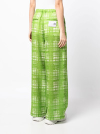 Random check pattern trousers green/white check pattern logo patch to the rear elasticated waistband wide leg two rear patch pockets Imported Composition Body: Polyester 100% SIZE & FIT Model measurements Height 5 ft 9 in(1.76 m) Bust/Chest 31.1 in(79 cm) Hips 35.03 in(89 cm) Waist 24.4 in(62 cm) FittingInformation This piece fits true to size. We recommend you get your regular size Designed to be fitted at the waist, loose over the leg Made with a mid-weight fabric Washing instructions Hand Wash