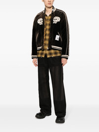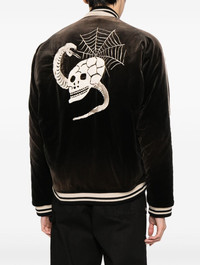 Souvenir velvet bomber jacket Made in Japan from soft velvet, the Souvenir jacket by Maison Mihara Yasuhiro is imagined in brown. Decorated with skull embroidery on the front and back, its relaxed silhouette is framed with striped and ribbed trims. Highlights - Chocolate brown - Velvet - Quilted lining - Applique detail - Embroidered design - Ribbed band collar - Long sleeves - Front zip fastening - Two side slit pockets - Ribbed trim - Stripe detailing - Straight hem Imported Composition Body: Cotton 100% Lining: Polyester 100% Filling: Polyester 100% Wool 100% SIZE & FIT Model measurements Height 6 ft 2 in(1.87 m) Bust/Chest 34.25 in(87 cm) Hips 36.22 in(92 cm) Waist 29.52 in(75 cm) FittingInformation Designed for a boxy fit, intended for a loose fit throughout The ribbed hem offers a close, comfortable fit Made from a padded non-stretch fabric, giving it no natural elasticity This piece fits true to size – take your usual size