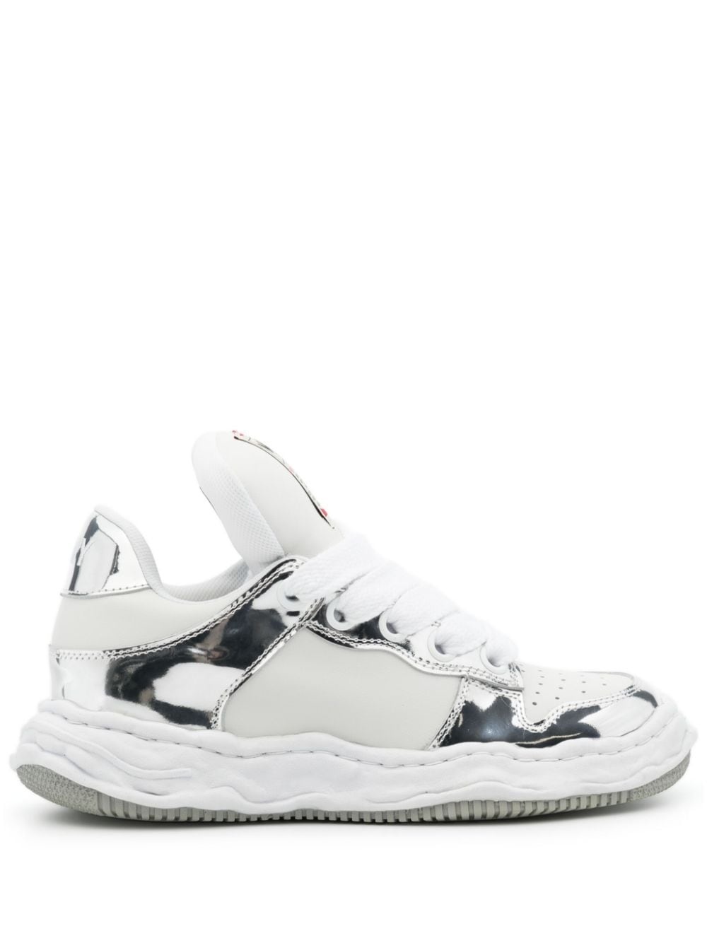 Wayne lace-up sneakers Maison Mihara Yasuhiro's Wayne sneakers are crafted from leather with silver-tone accents. Underfoot, they're distinguished by their avant-garde hand-modelled sole. Highlights - White/silver-tone - Calf leather - Panelled design - Perforated toebox - Round toe - Front lace-up fastening - Logo patch at the tongue - Branded heel counter - Branded insole - Rubber sole Imported Composition Leather 100% SIZE & FIT Measurement HEEL 1.77 in(4.5 cm) HEIGHT 3.54 in(9 cm) Sole height 1.37 in(3.5 cm)