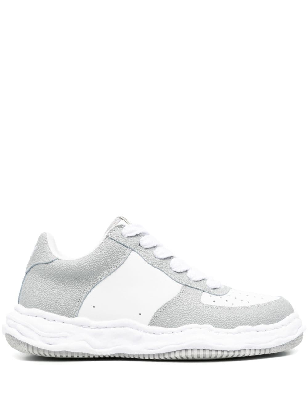 Wayne low-top sneakers Set atop the label's signature warped rubber outsole, these Wayne sneakers are a staple choice from Maison Mihara Yasuhiro's AW23 collection. Presented in a grey and white colourway, they feature a tonal embroidered logo and perforated toebox. Highlights - Light grey/off-white - Panelled design - Perforated detailing - Embroidered logo to the front - Logo patch at the tongue - Round toe - Front lace-up fastening - Branded insole - Rubber sole Imported Composition Other fibres 100% SIZE & FIT Measurement HEEL 1.57 in(4 cm) Sole height 1.18 in(3 cm)