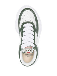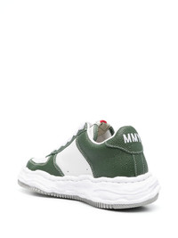Wayne low-top sneakers Set atop Maison Mihara Yasuhiro's signature warped rubber outsole, these Wayne sneakers are an AW23 staple. Presented in a white and green colourway, they feature a tonal embroidered logo and perforated toebox. Highlights - White/green - Calf leather - Panelled design - Perforated toebox - Embroidered logo to the front - Logo patch at the tongue - Branded heel counter - Round toe - Front lace-up fastening - Branded insole - Chunky rubber sole Imported Composition Leather 100% SIZE & FIT Measurement HEEL 1.57 in(4 cm) Sole height 1.18 in(3 cm)