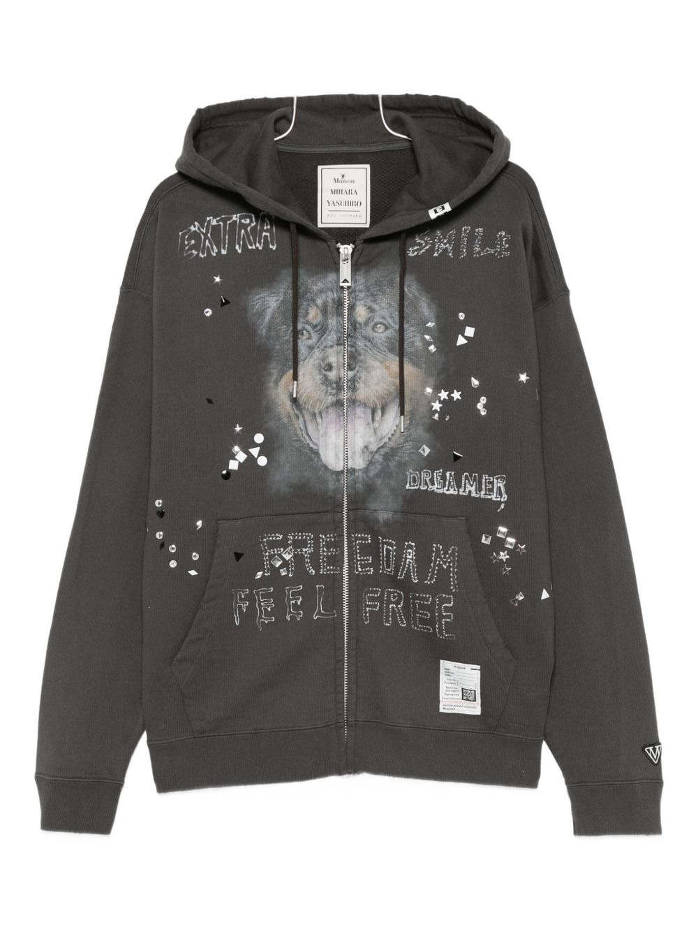 zip-up cotton hoodie Highlights - Black - Cotton - Dog graphic - Front zip fastening - Drawstring hood - Front pouch pockets Imported Composition Cotton 100% SIZE & FIT Model measurements Height 6 ft 2 in(1.87 m) Bust/Chest 36.41 in(92.5 cm) Hips 37 in(94 cm) Waist 29.52 in(75 cm) Washing instructions Read Manufacturer Guidelines