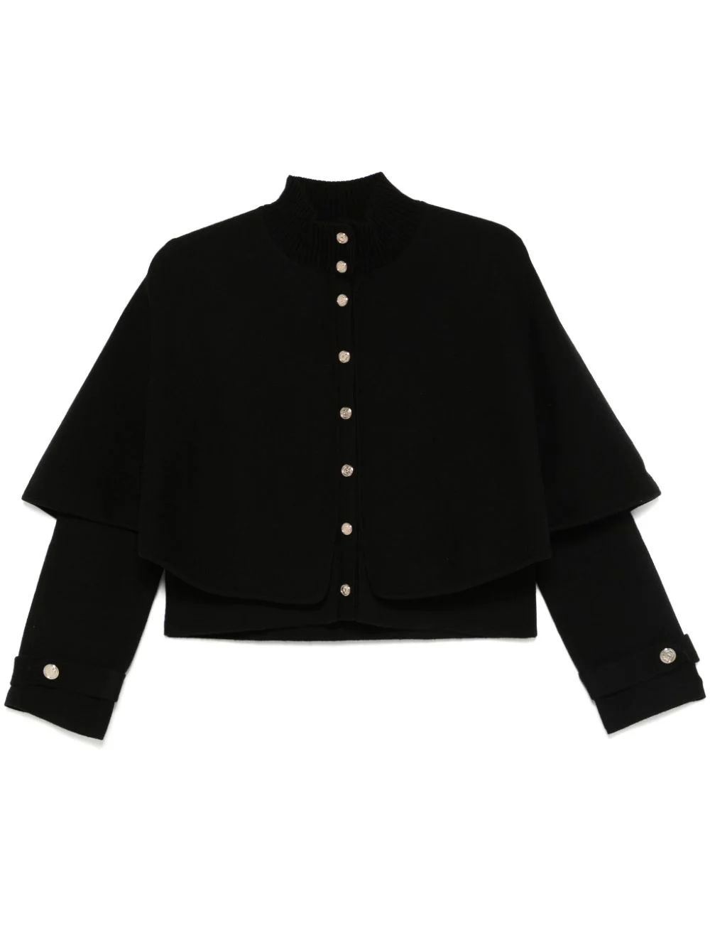 cape-effect cardigan Highlights - Black - Knitted construction - Cape design - Layered design - Ribbed edge - Mock neck - Button fastening - Long sleeves - Straight hem Imported Composition Nylon 100%, Alpaca Wool 45%, RWS Wool 30%, Recycled Polyamide 25% Washing instructions Hand Wash
