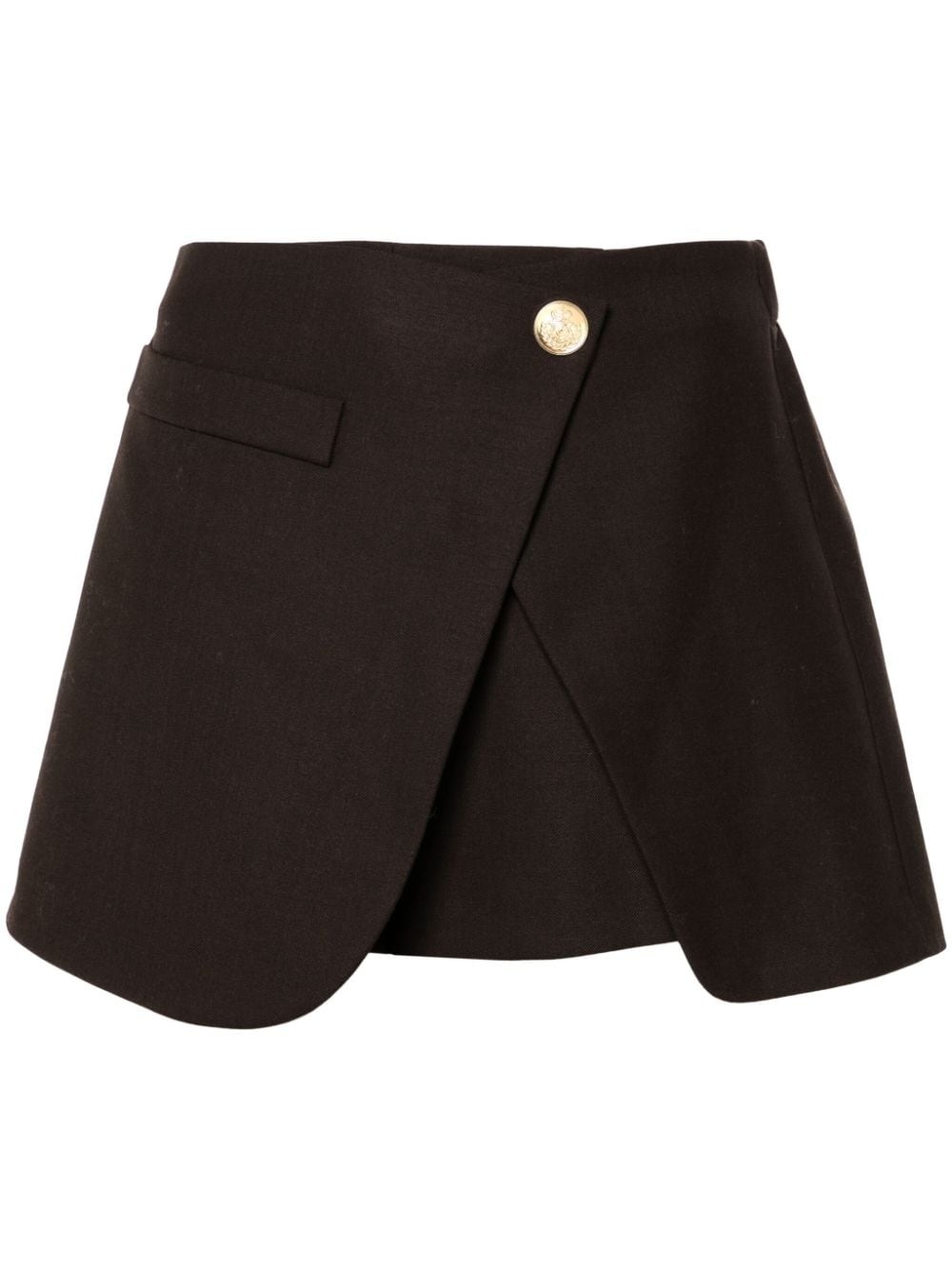 draped skort Highlights - Cedar brown - Twill weave - Draped panel detail - Faux pocket detail - Logo-engraved buttons - Off-centre front button fastening - Rear elasticated waistband - Rear zip fastening - Thigh-length - Unlined Imported Composition Polyester 52%, Wool 26%, Viscose 18%, Elastane 4% Washing instructions Dry Clean Only