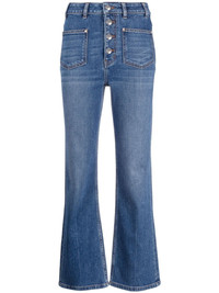 high-rise flared jeans Crafted from cotton in a blue hue, Maje's Passiony high-waisted jeans are cut for a flared leg and finished with a stonewashed effect. Highlights - Blue - Cotton blend - Logo patch to the rear - Stonewashed - High waist - Belt loops - Button fly fastening - Two front patch pockets - Two rear patch pockets - Flared design Imported Composition Leather 100%, Cotton 99%, Elastane 1% SIZE & FIT Model measurements Height 5 ft 10 in(1.78 m) Bust/Chest 31.49 in(80 cm) Hips 35.43 in(90 cm) Waist 24.4 in(62 cm) FittingInformation This piece fits true to size. We recommend you get your regular size Designed to be fitted at the waist and through the thigh, loose from the knee Made with a mid-weight fabric Washing instructions Machine Wash