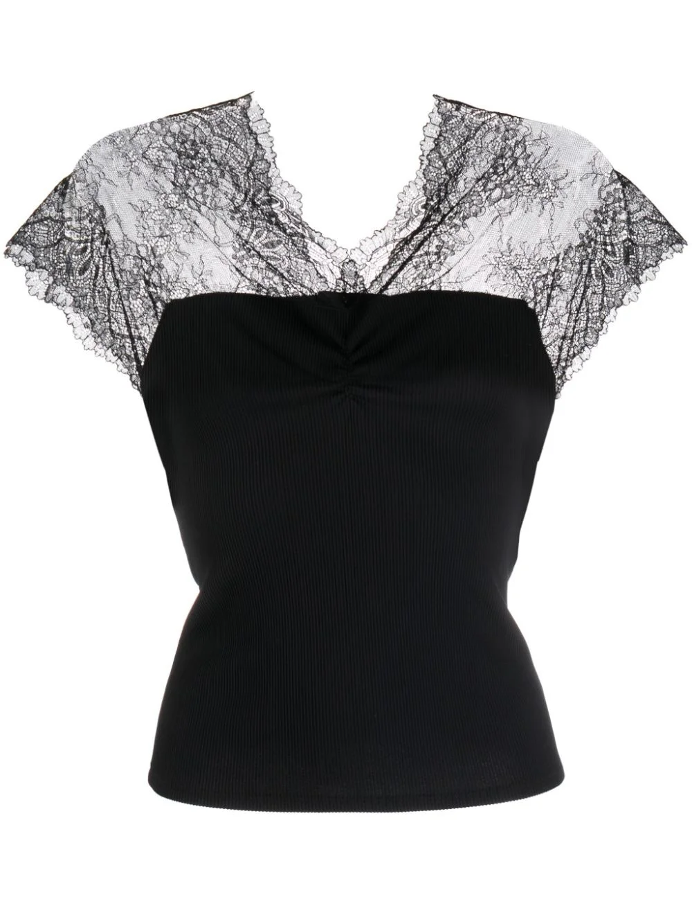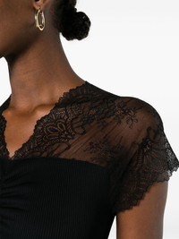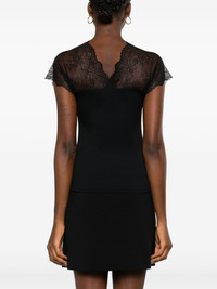 lace-trim jersey top With a semi-sheer lace panel and close-fitting silhouette, this black top by Maje speaks to the label's elegant Parisian style. Highlights - Black - Lace panelling - Semi-sheer construction - V-neck - Short sleeves - V-back - Straight hem Imported Composition Polyamide 77%, Spandex/Elastane 23% SIZE & FIT Model measurements Height 5 ft 10 in(1.78 m) Bust/Chest 31.49 in(80 cm) Hips 37 in(94 cm) Waist 23.62 in(60 cm) FittingInformation Designed for a slim fit that sits just away from the body offering a close yet comfortable fit Made from a midweight stretch fabric, this piece offers elasticity and flexibility when worn This piece fits true to size – take your usual size Washing instructions Machine Wash