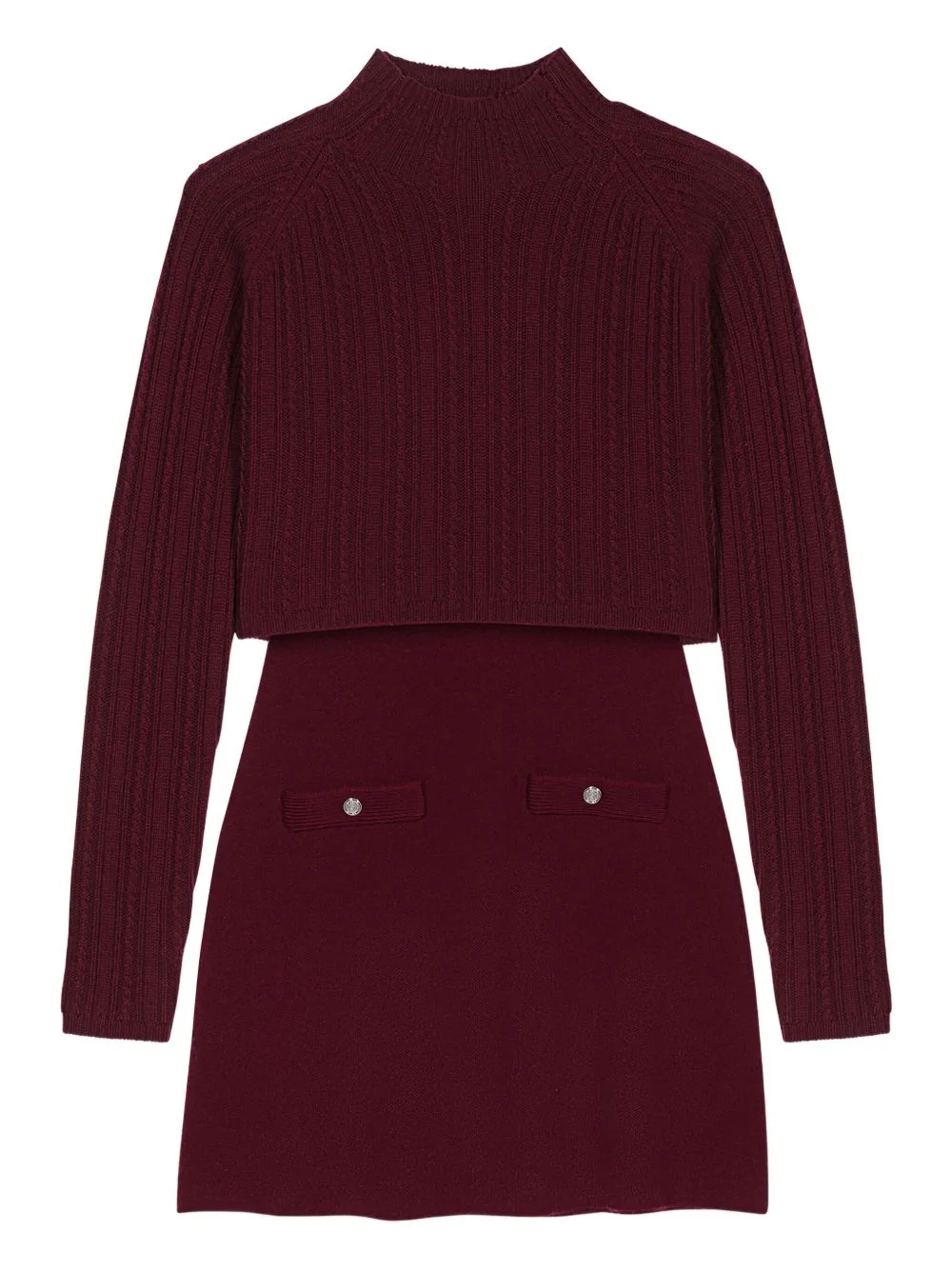 layered mini sweater dress Highlights - Burgundy - Sleeveless - Round neck - Long-sleeve sweater - Concealed fastening - Layered design Imported Composition Acrylic 45%, Polyamide 30%, Wool 25% SIZE & FIT FittingInformation Designed for a slim fit that sits just away from the body offering a close yet comfortable fit Made with a midweight knit, this piece offers some stretch Washing instructions Hand Wash