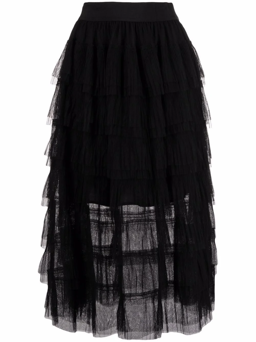layered tulle midi skirt jet-black layered design tulle overlay high-waisted mid-length Imported Composition Outer: Polyester 100% Lining: Viscose 100% SIZE & FIT Model measurements Height 5 ft 10 in(1.77 m) Bust/Chest 31.1 in(79 cm) Hips 33.85 in(86 cm) Waist 24.01 in(61 cm) FittingInformation This piece fits true to size. We recommend you get your regular size Designed for a loose fit with a close fit at the waist Made with a mid-weight fabric Washing instructions Machine Wash