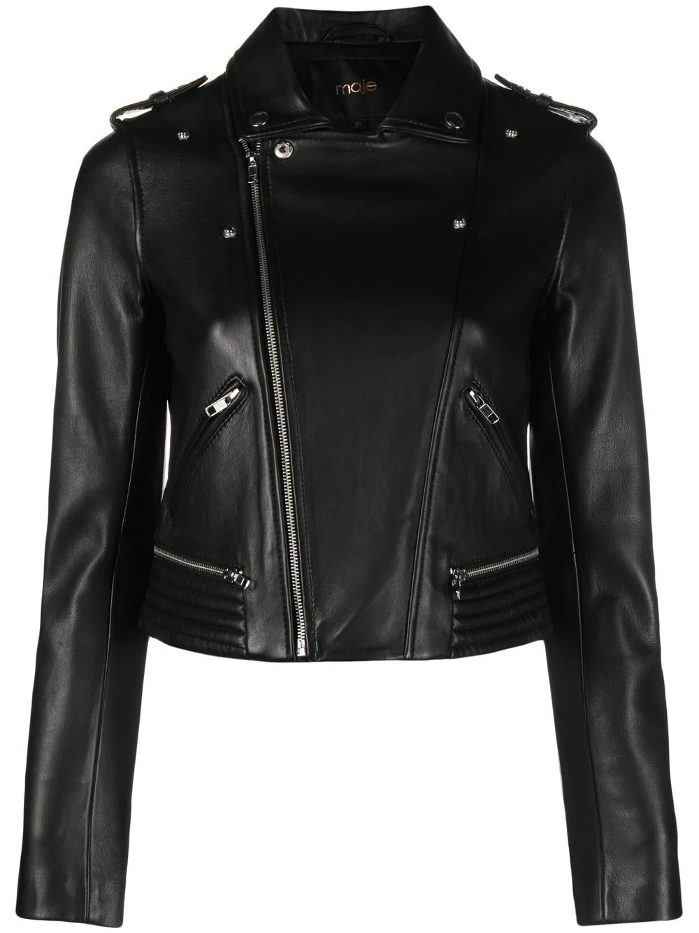 leather biker jacket Highlights - Black - Lambskin - Cotton blend - Notched collar - Epaulettes - Press-stud fastening - Off-centre front zip fastening - Front zip fastening pockets - Long sleeves - Full lining Imported Composition Outer: Lamb Skin 100% Lining: Cotton 60%, Polyester 40% Washing instructions Specialist Cleaning
