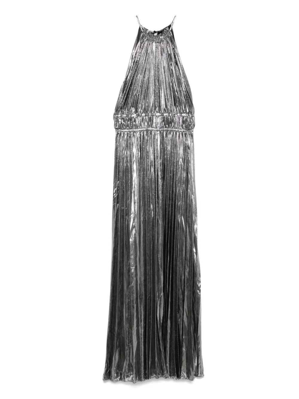 metallic pleated dress Highlights - Silver-tone - Pleated design - Halterneck - Sleeveless - Midi length - Straight hemline - Metallic finish Imported Composition Polyester 100%, Mother of Pearl 100% SIZE & FIT Model measurements Height 5 ft 9 in(1.75 m) Bust/Chest 34.64 in(88 cm) Hips 36.61 in(93 cm) Waist 26.37 in(67 cm) Washing instructions Hand Wash