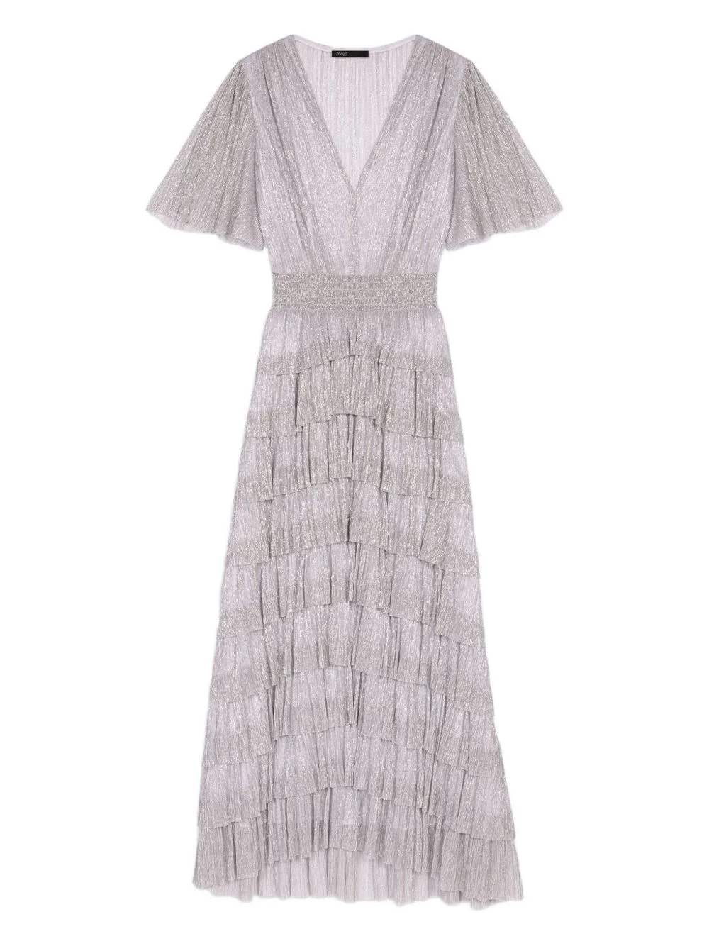 metallic ruffled dress Highlights - Silver - V-neck - Short sleeves - Elasticated waistband - Tiered ruffles Imported Composition Outer: Polyester 57%, Metallic Fibre 43% Lining: Viscose 100% Washing instructions Dry Clean Only