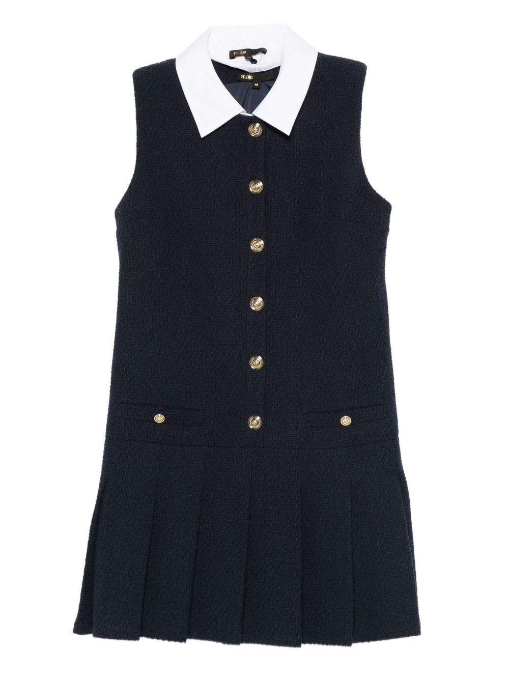 pleated-collar dress Highlights - Navy blue - Pleated skirt - Button fastening - Sleeveless - Classic collar - Gold buttons Imported Composition Outer: Cotton 63%, Polyester 24%, Acrylic 12%, Elastane 1% Lining: Polyester 94%, Elastane 6% Washing instructions Dry Clean Only