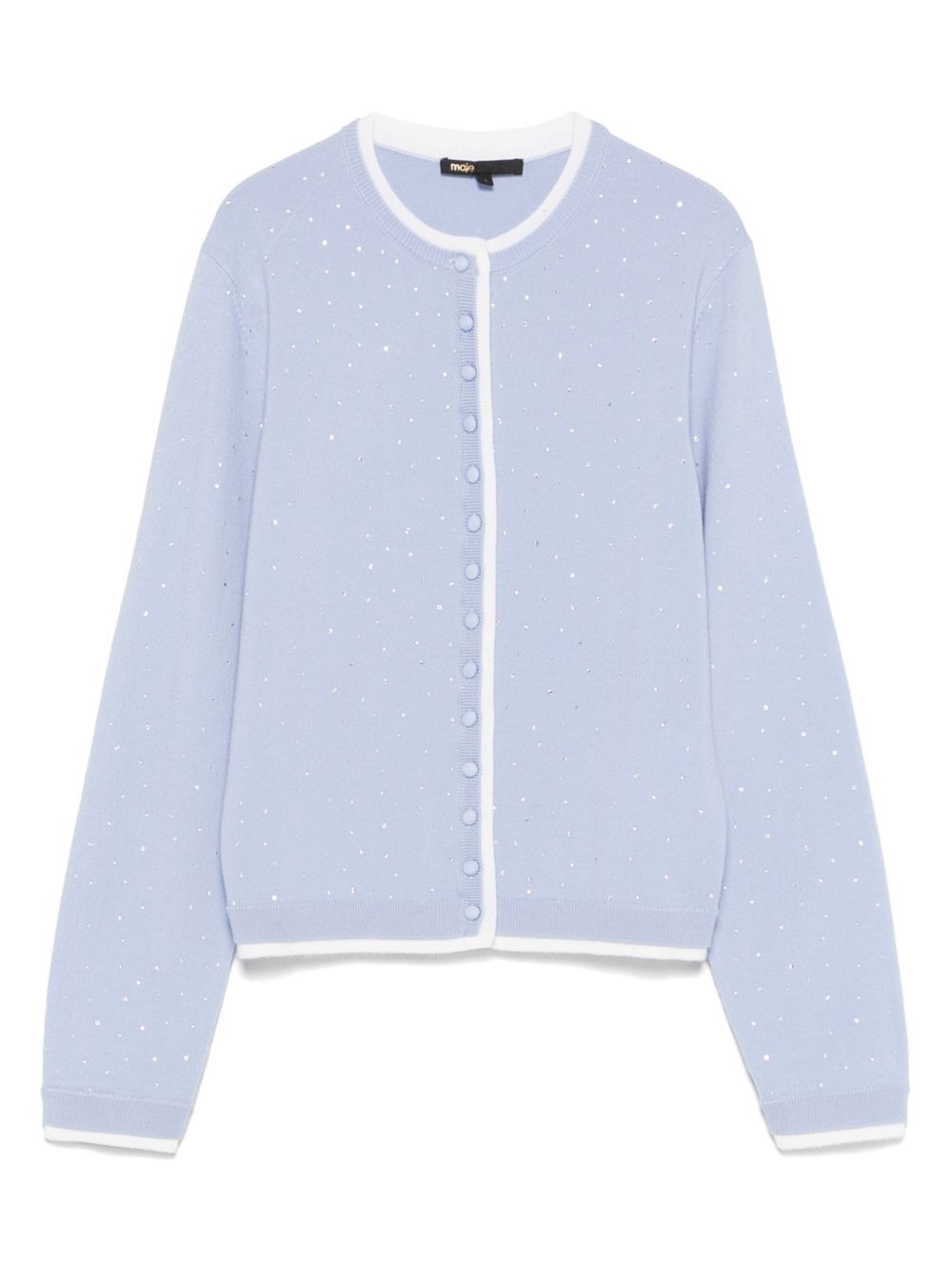 rhinestone-embellished cardigan Highlights - Light blue - Front button fastening - Contrasting trim - Crew neck - Long sleeves Imported Composition Elastane 100%, RWS Wool 100% SIZE & FIT Model measurements Height 5 ft 9 in(1.75 m) Bust/Chest 32.67 in(83 cm) Hips 36.22 in(92 cm) Waist 24.8 in(63 cm) FittingInformation Designed for a slim fit that sits just away from the body offering a close yet comfortable fit Made with a midweight knit, this piece offers some stretch Washing instructions Hand Wash