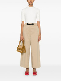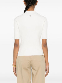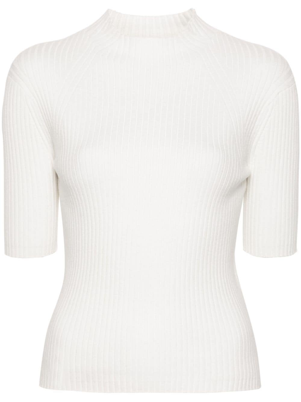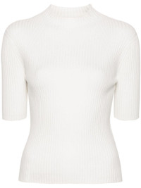 ribbed-knit top Highlights - Cream white - Cotton blend - Knitted construction - Ribbed knit - High neck - Short sleeves - Raw-cut hem Imported Composition Cotton 58%, Polyamide 31%, Silk 9%, Elastane 2% SIZE & FIT Model measurements Height 5 ft 9 in(1.76 m) Bust/Chest 31.1 in(79 cm) Hips 36.61 in(93 cm) Waist 24.8 in(63 cm) FittingInformation Designed for a close fit throughout Made with a midweight knit, this piece offers some stretch This piece fits true to size – take your usual size Washing instructions Hand Wash